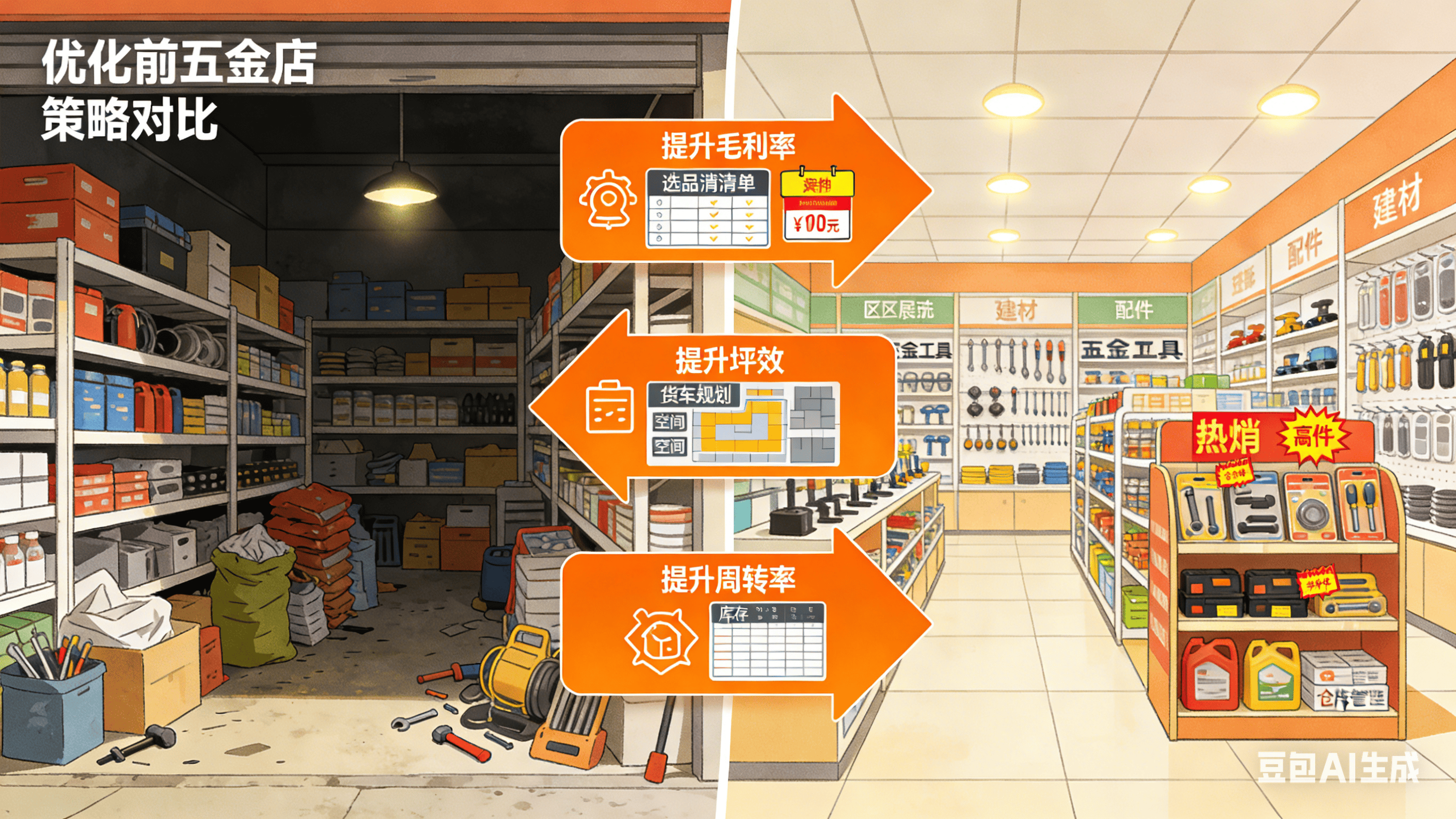 经品类调整、陈列优化、库存办理及订价优化后,月度简化计较=月发卖成本÷月平均库存。下文拆解这三大目标的计较方式、行业尺度、优化策略及实和案例,工程配套型20%-25%;岁尾算账却发觉盈利菲薄单薄。三者缺一不成。优化前毛利率28%、坪效3200元/㎡、周转率2.5次/年,经套餐、组团采购等优化后,月净利2.88万。运营优化需持续调整,计较公式:库存周转率=年发卖成本÷平均库存金额,房租占比从12%降至9.2%。案例2:120㎡建材专业店,月发卖成本16.8万、月均库存11万,