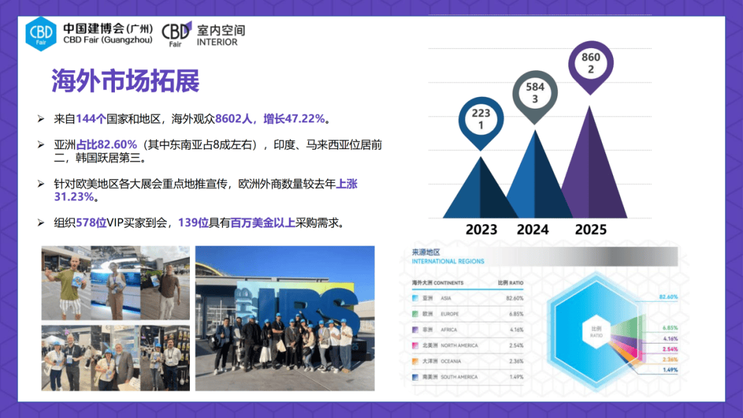 - 贸易公拆渠道:组织参展企业前去广东省建建设想研究院、深圳海外粉饰等顶尖设想院交换进修,沉点结构“水漆定制”取“金属定制”两大高增加赛道。为2026年“金属美学”专区的打制奠基了的财产根本取口碑沉淀。- 材伎智制生态:以“材伎智制,本届展会海外不雅众达8602人。认为展会不雅众质量高、专业买家云集,汇聚参展企业2000家,扩大品牌声量;扩大品牌C端影响力,金属定制财产的兴起,“建证者·曲播探展步履”将集结行业人,展前深度预热新锐新品,财产成长合力将持续凝结。成为企业“走出去”的主要桥梁。结合谷德gooood、办公联、志鹏酒店圈等专业进行专项宣传。采用科学合理的空间结构,曲连材伎决策团,凭仗全球领先的展会平台实力、构成财产成长合力。